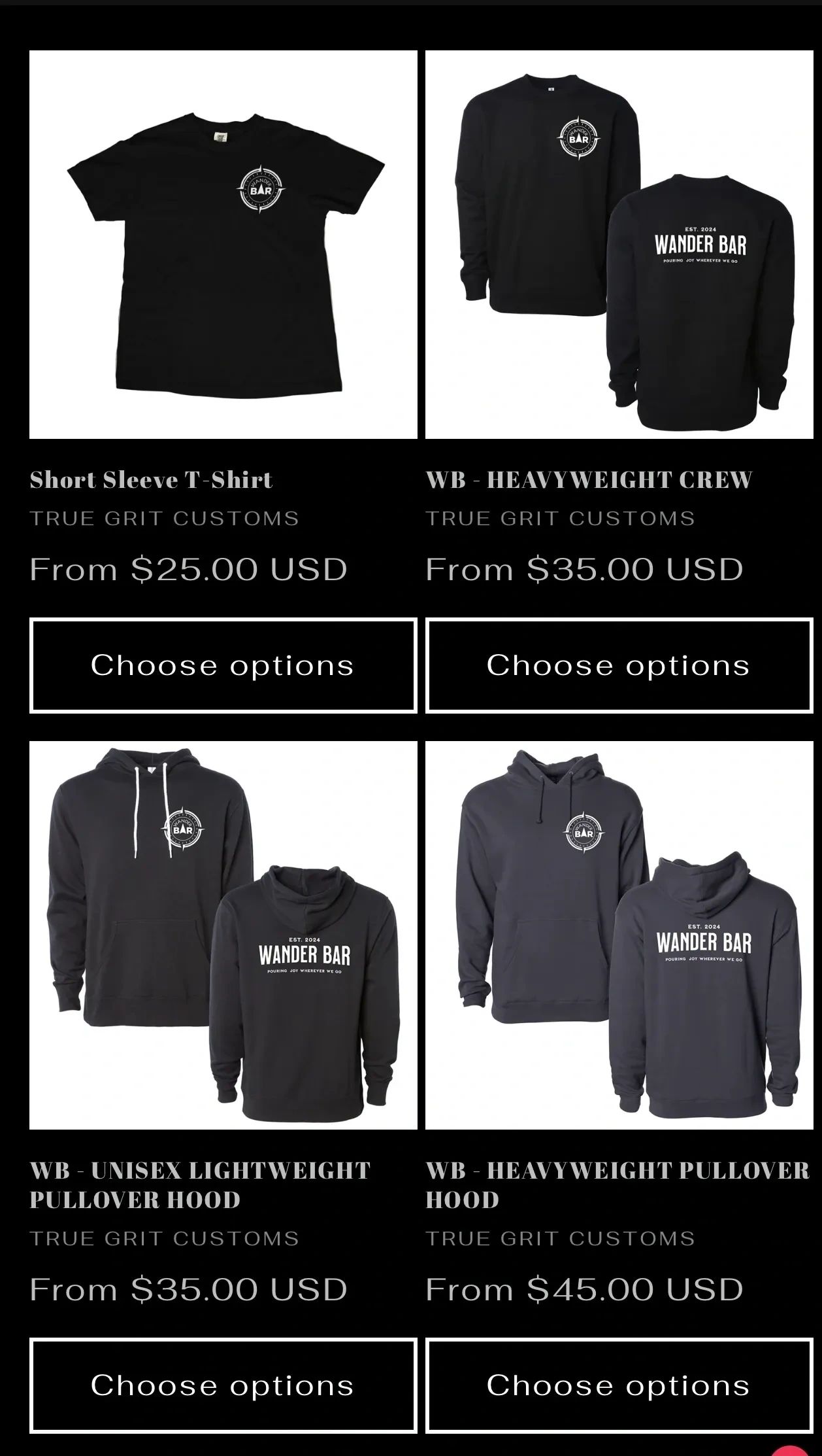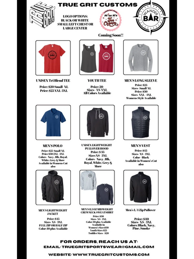 Looking to rock some Wander Bar and Miss K's gear around town? Well, look no further than our collaboration with True Grit Customs. Miguel has created a high quality clothing line at reasonable prices. You can email your order to truegritsportswear@gmail.com and you'll be looking stylish in no time!